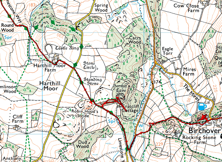 1...The tangled track at Birchover is the result of exploring a hill topped with overhanging rocks. A tunnel through the rocks was traversed twice!